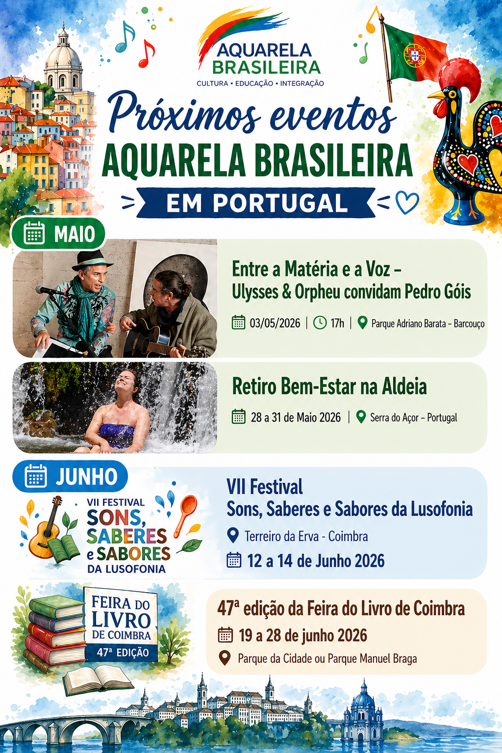 A Aquarela Brasileira segue promovendo encontros que fortalecem os laços entre Brasil e Portugal, com uma programação diversa que celebra a arte, a língua e a convivência. Entre maio e junho de 2026, Coimbra e outras regiões recebem iniciativas que atravessam a música, a literatura, as artes performativas e o bem-estar.